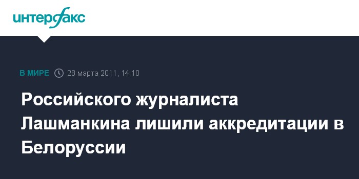 "Лашманкин лишен аккредитации в связи с нарушением белорусского законодательства", - сообщили во внешнеполитическом ведомстве, отметив, что комиссия по рассмотрению вопросов аккредитации журналистов иностранных СМИ приняла соответствующее решение еще 25 марта.