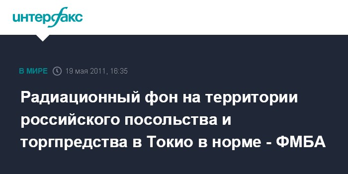 Москва. 19 мая. INTERFAX.RU - Эксперты Федерального медико-биологического агентства России проверили радиационный фон на территории российских загранучреждений в Токио.
