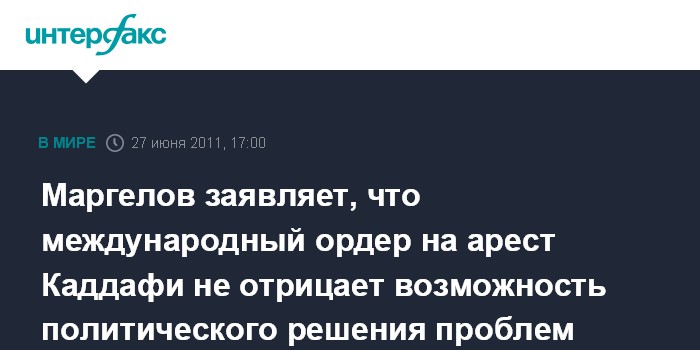 Москва. 27 июня. INTERFAX.RU - Спецпредставитель президента РФ по Африке, глава комитета по международным делам Совета Федерации Михаил Маргелов считает, что решение Международного уголовного суда (МУС) о выдаче ордера на арест Муамара Каддафи не закрывает возможность для политического урегулирования в Ливии.