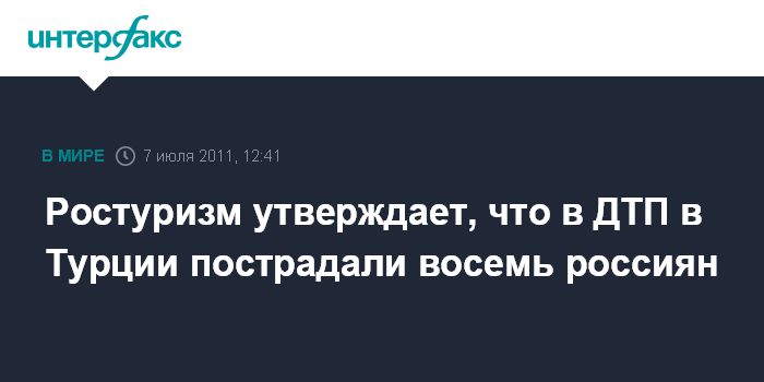 Москва. 7 июля. INTERFAX.RU - Федеральное агентство по туризму (Ростуризм) подтвердило факт ДТП с российскими туристами в четверг утром на турецком курорте Анталья.