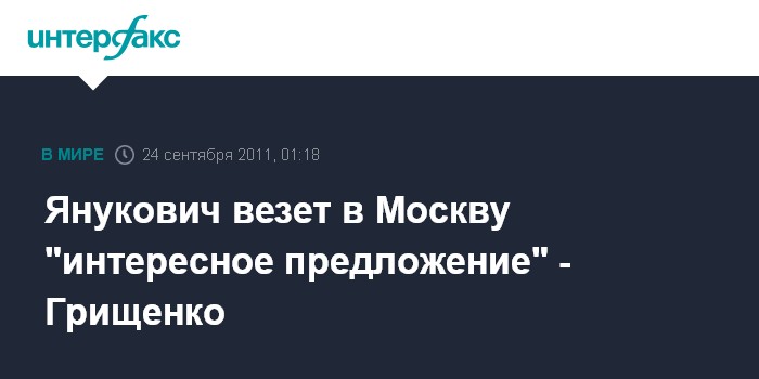 Киев. 24 сентября. ИНТЕРФАКС-УКРАИНА - Президент Украины Виктор Янукович везет "интересное предложение" в Москву, сообщил министр иностранных дел Константин Грищенко.