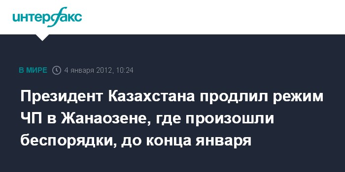 Астана. 4 января. INTERFAX.RU - Президент Казахстана Нурсултан Назарбаев подписал указ "О продлении действия чрезвычайного положения в городе Жанаозен Мангистауской области".