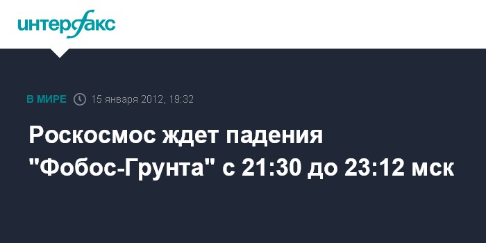 Москва. 15 января. INTERFAX.RU - Российская межпланетная станция "Фобос-Грунт" упадет на землю в интервале с 21:30 мск по 23:12 мск в воскресенье, сообщает Роскосмос.