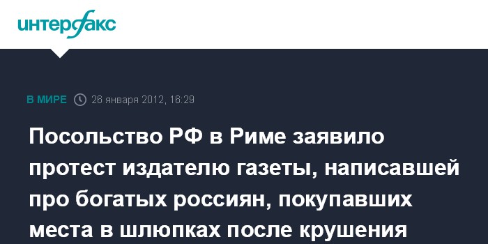 Москва. 26 января. INTERFAX.RU - Посольство РФ в Италии направило протест издателям одной из местных газет в связи с распространением недостоверной информации о том, что находившиеся на борту потерпевшего крушение круизного лайнера "Costa Concordia" покупали места на спасательных шлюпках, заявил официальный представитель российского МИД Александр Лукашевич.