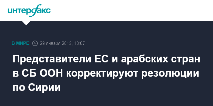 Нью-Йорк (ООН). 29 января. INTERFAX.RU - Представители ЕС и арабских стран в Совете безопасности ООН начали корректировать резолюцию по Сирии, которая должна быть представлена на будущей неделе на рассмотрение Совбеза, сообщили западные дипломаты журналистам. Они отметили, что приостановка деятельности наблюдателей ЛАГ в Сирии по соображениям их безопасности, о чем было объявлено в субботу, требует скорейшего принятия резолюции.