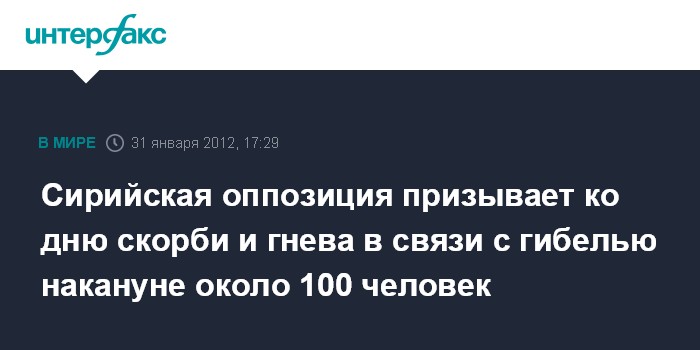 Дубай. 31 января. INTERFAX.RU - Оппозиционный Сирийский национальный совет (СНС) выступил за проведение акции протеста под названием "день скорби и гнева" после того, как в понедельник жертвами столкновений в стране стали около 100 человек, сообщает издающаяся в ОАЭ англоязычная газета "Халидж таймс".