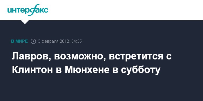 Москва. 3 февраля. ИНТЕРФАКС - Глава МИД РФ Сергей Лавров сообщил, что, возможно, в субботу "на полях" Мюнхенской конференции по безопасности состоится его двусторонняя встреча с госсекретарем США Хиллари Клинтон.