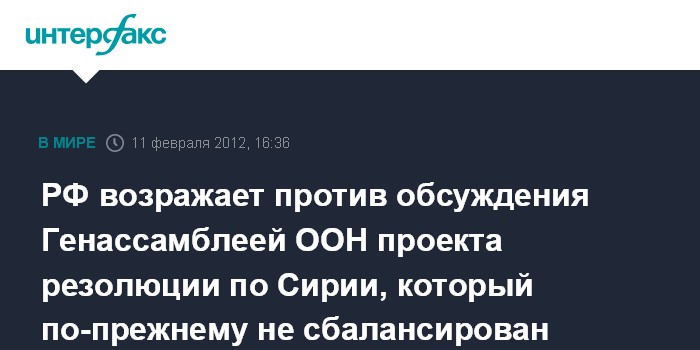 РФ возражает против обсуждения Генассамблеей ООН проекта резолюции по Сирии, который по-прежнему не сбалансирован