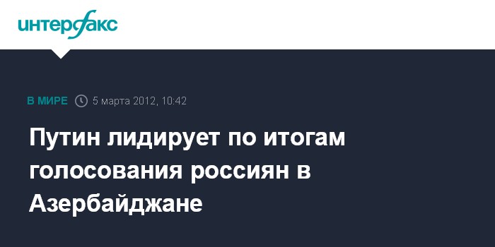 Баку. 5 марта. INTERFAX.RU - Кандидат в президенты РФ Владимир Путин набрал наибольшее количество голосов среди российских граждан в Азербайджане.