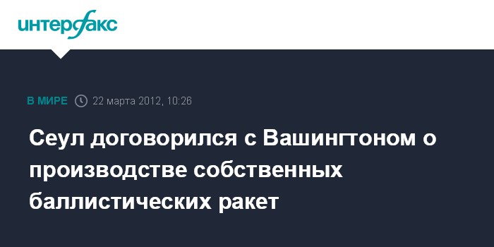 Сеул. 22 марта. INTERFAX.RU - Южнокорейские и американские военные договорились о том, что США не будут возражать против того, чтобы Южная Корея обладала или же самостоятельно производила баллистические ракеты большой дальности, сообщили в четверг местные СМИ со ссылками на высказывание президента Южной Кореи Ли Мен Бака.