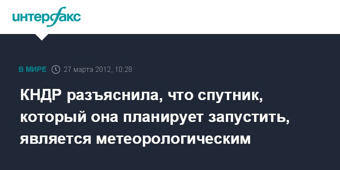 Сеул. 27 марта. INTERFAX.RU - Спутник, который Северная Корея планирует запустить в середине апреля, является метеорологическим, сообщило Центральное телеграфное агентство Кореи (ЦТАК) во вторник.