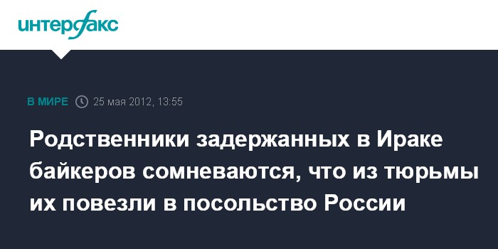 Москва. 25 мая. INTERFAX.RU - Задержанных несколько дней назад в Ираке российских мотоциклистов-экстремалов вывезли из багдадской тюрьмы в неизвестном направлении, сообщают их родственники.
