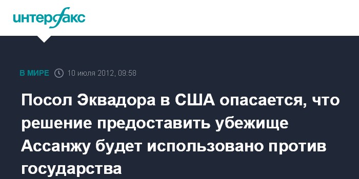 Лима. 10 июля. INTERFAX.RU - Посол Эквадора в США Натали Сейли опасается, что решение властей Эквадора предоставить основателю сайта Wikileaks Джулиану Ассанджу политическое убежище, может быть использовано Вашингтоном против Кито, сообщают во вторник местные СМИ.