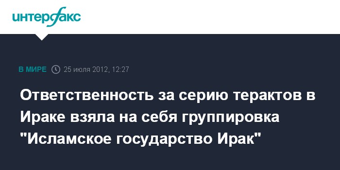 Дубай. 25 июля. INTERFAX.RU - Группировка, называющая себя "Исламское государство Ирак" и имеющая связи с "Аль-Каидой", взяла на себя ответственность за серию терактов в Ираке, которые привели к гибели более сотни людей в различных городах страны.