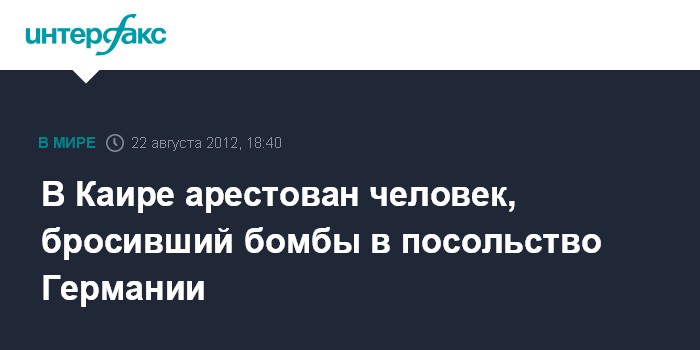 Каир. 22 августа. INTERFAX.RU - Египетские полицейские в среду арестовали мужчину, бросившего на территорию посольства ФРГ в Каире четыре самодельные бомбы, сообщили журналистам представители немецкой дипмиссии.