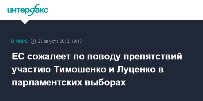 Брюссель 29 августа. INTERFAX.RU - Руководство ЕС выразило сожаление в связи с тем, что сложившаяся на Украине ситуация будет препятствовать участию в предстоящих парламентских выборах двум лидерам оппозиции - экс-премьеру Юлии Тимошенко и экс-главы МВД Юрия Луценко.