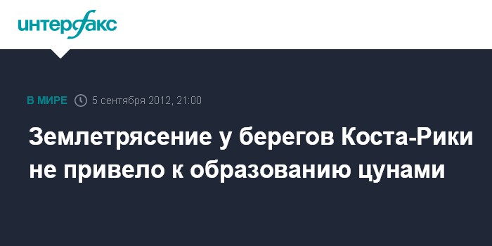 Мехико. 5 сентября. INTERFAX.RU - Власти Коста-Рики заверяют, что произошедшее у берегов их страны сильное землетрясение не привело к формированию цунами, передает в среду вечером агентство EFE.