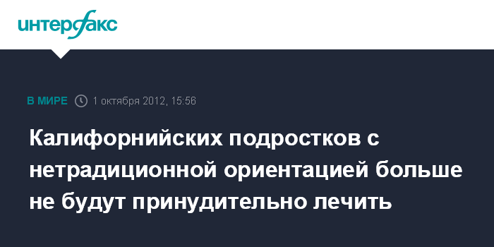 Вашингтон. 1 октября. INTERFAX.RU - Губернатор Калифорнии Джерри Браун подписал закон, согласно которому гомосексуальные подростки отныне не будут проходить принудительное лечение, направленное на смену ориентации, говорится в его заявлении, распространенном в понедельник.
