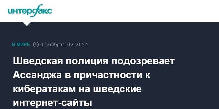 Стокгольм. 1 октября. INTERFAX.RU - Шведская полиция установила связь между временным выходом из строя интернет-сайтов и ходом дела основателя Wikileaks Джулиана Ассанджа, сообщил в понедельник представитель полиции страны Андерс Альквист.