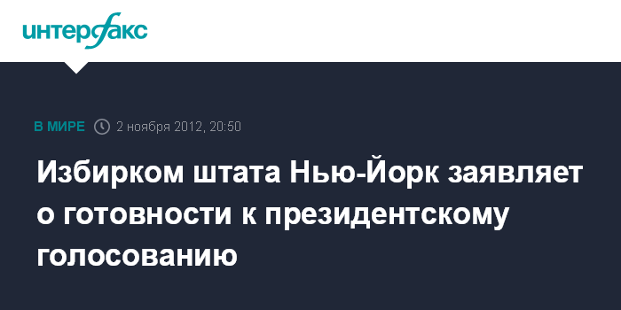 Вашингтон. 2 ноября. INTERFAX.RU - Избирательная комиссия американского штата Нью-Йорк заявила в пятницу о том, что последствия урагана "Сэнди" не помешают голосованию в день выборов президента США. "Мы будем готовы шестого ноября", - заявил представитель комиссии.