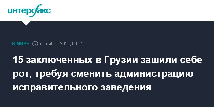 "До 15 заключенных в знак протеста зашили себе рот. Часть заключенных утверждает, что местная администрация угрожает им расправами и введением на территорию колонии спецназа. Вместе с тем, пока сотрудники колонии не предпринимали никаких противозаконных действий против заключенных", - сказал Д.Лордкипанидзе журналистам.