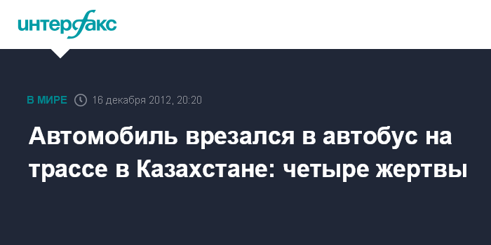 Караганда. 16 декабря. ИНТЕРФАКС-КАЗАХСТАН - В Карагандинской области Казахстана в результате столкновения автобуса с легковой машиной "Тойота" погибли четыре человека, один пострадал.