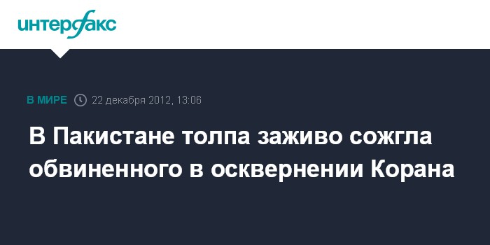 Исламабад. 22 декабря. INTERFAX.RU - Разъяренная толпа ворвалась в полицейский участок в восточной пакистанской провинции Синд и заживо сожгла мужчину, арестованного по обвинению в богохульстве, сообщил в субботу представитель местной полиции Усман Гани.