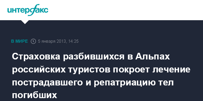 Москва. 5 января. INTERFAX.RU - Российские туристы, разбившиеся на снегоходе в итальянских Альпах, были застрахованы в компании "Альфа-страхование", каждый на 30 тыс. евро, сообщили порталу "Интерфакс-Туризм" в туркомпании "Данко", клиентами которой были туристы.