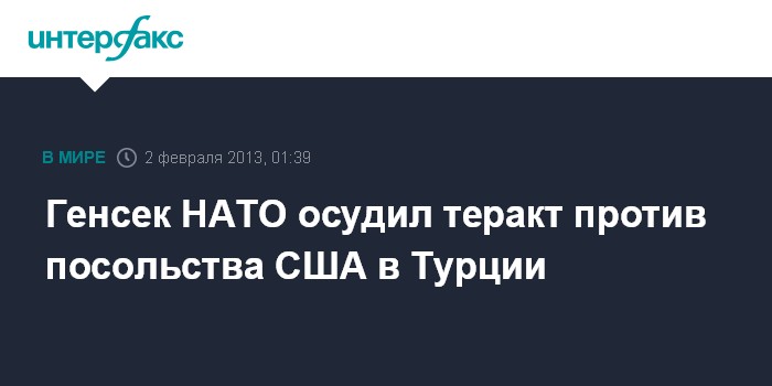 Брюссель. 2 февраля. ИНТЕРФАКС - По мнению генерального секретаря Североатлантического альянса Андерса Фог Расмуссена, взрыв у американского посольства в Турции 1 февраля является недопустимым актом против дипломатической миссии одной из стран НАТО на территории другой страны этой организации.