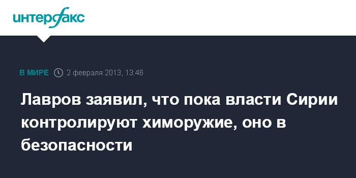 Мюнхен. 2 февраля. INTERFAX.RU - Пока власти Сирии контролируют свое химоружие, оно в безопасности, заявил глава МИД РФ Сергей Лавров. "Мы уверены, что пока правительство сохраняет контроль над этим оружием, ситуация безопасна", - сказал он на Мюнхенской конференции по безопасности в субботу.