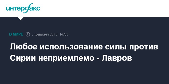 Мюнхен. 2 февраля. INTERFAX.RU - Россия выступает против гуманитарного коридора для Сирии и использования силы про нее, заявил министр иностранных дел России Сергей Лавров. "Говоря об использовании гуманитарного коридора и большей поддержки - нет. Любое использование сил является неприемлемым, не только потому что мы до сих пор помним, что было сделано согласно резолюции Совбеза по Ливии, а потому что ситуация требует недопущения военного вмешательства, немедленного прекращения насилия", - сказал С.Лавров в субботу, выступая на 49-й Мюнхенской конференции.
