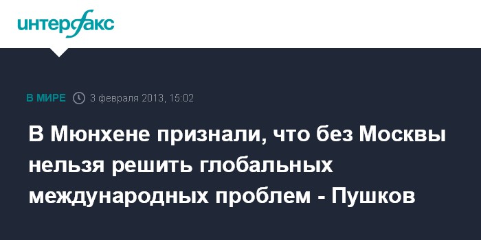 "Через выступления главных участников этого форума красной нитью проходила мысль о том, что страны НАТО считают, что без России крайне трудно будет находить решение глобальных международных проблем и это, я считаю одним из знаковых важных моментов международной конференции", - сказал А.Пушков "Интерфаксу" по телефону из Мюнхена в воскресенье.