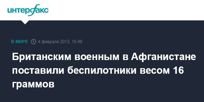 Лондон. 4 февраля. INTERFAX.RU - Министерство обороны Великобритании обеспечило британских военнослужащих в Афганистане сверхмалыми беспилотниками, передает в понедельник BBC.