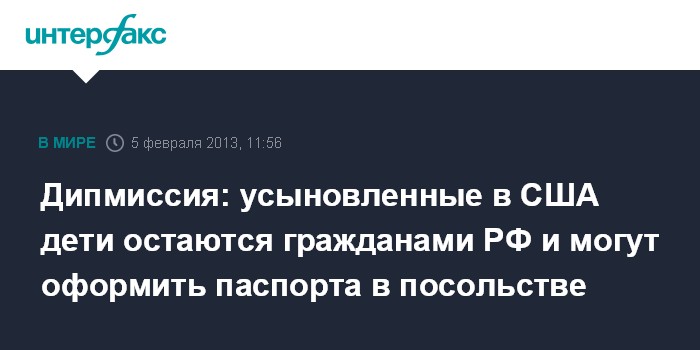 Вашингтон. 5 февраля. INTERFAX.RU - Российские дети, усыновленные в США еще в 90-х годах и получившие американский паспорт, не теряют российское гражданство и могут быстро оформить российский загранпаспорт в посольстве, сообщили в консульском отделе посольства России в Вашингтоне.