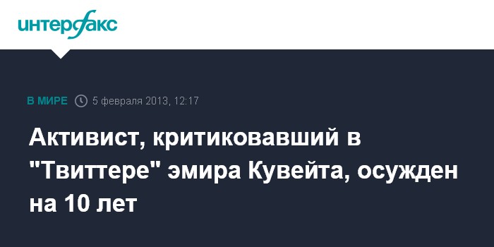 Дубай. 5 февраля. INTERFAX.RU - Суд Кувейта приговорил подданного страны Оранса аль-Рашеди к 10 годам лишения свободы за оскорбление эмира Сабах-ас-Сабаха, а также за призыв к свержению режима, сообщила во вторник кувейтская газета "Аль-Джарида".