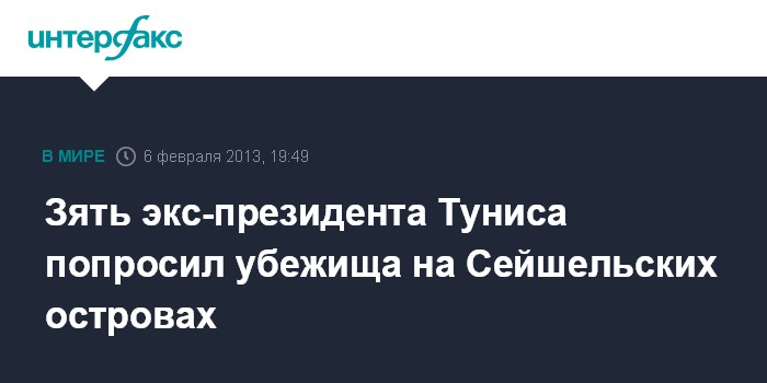 Йоханнесбург. 6 февраля. INTERFAX.RU - Зять бывшего президента Туниса Зина Абидина Бен Али Сахер Матери попросил политического убежища на Сейшельских островах, говорится в заявлении МИД островного государства, опубликованном в среду.
