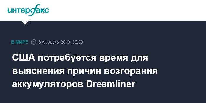 Вашингтон. 6 февраля. INTERFAX.RU - Специалистам из Национального управления безопасности перевозок (НУБП) США потребуется еще несколько недель для выявления причин инцидентов на борту самолетов Боинг-787 "Дримлайнер", сообщила в среду журналистам глава НУБП Дебора Херсман.