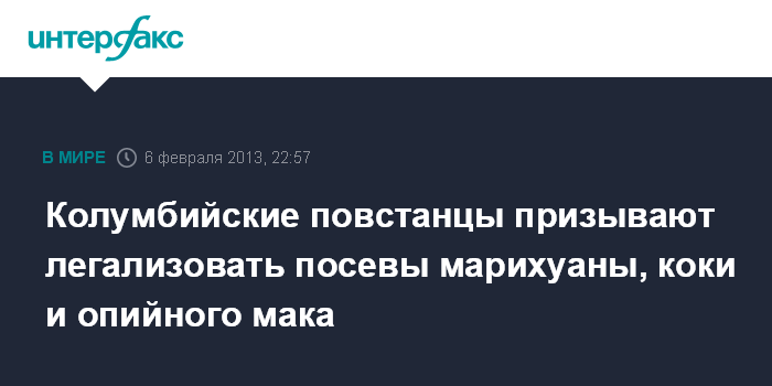Гавана. 6 февраля. INTERFAX.RU - Повстанческое движение Революционные вооруженные силы Колумбии (РВСК) выступило за частичную легализацию выращивания марихуаны, листьев коки и опийного мака, заявил глава делегации РВСК Иван Маркес.