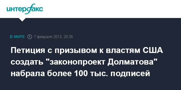Вашингтон. 7 февраля. INTERFAX.RU - Петиция с призывом к Конгрессу США разработать "законопроект Долматова", набрала более 100 тыс. подписей, что обязывает администрацию президента дать на нее официальный ответ.