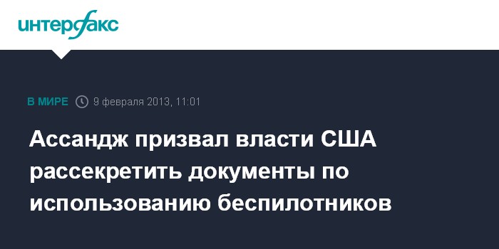 Вашингтон. 9 февраля. INTERFAX.RU - Основатель скандального сайта Wikileaks Джулиан Ассандж в видеоинтервью американскому телеканалу Эйч-би-оу призвал Вашингтон рассекретить программу по использованию беспилотников для борьбы с террористами. "Не вижу большего упадка (политической - ИФ) системы, чем когда исполнительная власть убивает своих граждан произвольно по своему усмотрению, секретно, никак не сообщая о принятии своего решения обществу", - заявил он, призвав власти США сделать данную информацию открытой для всех.