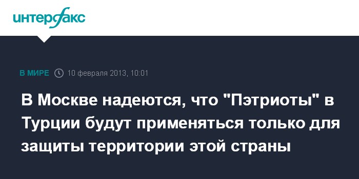 Москва. 10 февраля. INTERFAX.RU - В Москве рассчитывают, что противоракетные комплексы "Пэтриот", размещенные на турецко-сирийской границе, не будут использоваться в иных целях, нежели защита территории Турции, заявил посол РФ в Анкаре Владимир Ивановский.