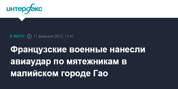 Париж. 11 февраля. INTERFAX.RU - Армия Франции в ночь на понедельник нанесла авиаудар по занятому мятежниками отделению полиции в малийском городе Гао, сообщают французские СМИ со ссылкой на очевидцев.