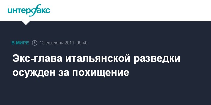 Лондон. 13 февраля. INTERFAX.RU - Бывший глава военной разведки Италии Николо Поллари приговорен к десяти годам заключения за причастность к похищению подозреваемого в терроризме, сообщает британская телерадиовещательная корпорация BBC в среду.