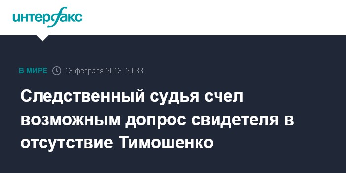 Киев. 13 февраля. INTERFAX.RU - Следственный судья Оксана Царевич сочла возможным допрос свидетеля в уголовном производстве об убийстве народного депутата Евгения Щербаня в отсутствие подозреваемой экс-премьера Юлии Тимошенко.