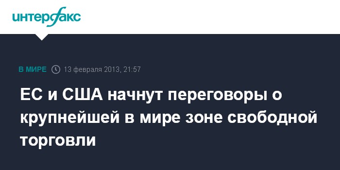Брюссель. 13 февраля. INTERFAX.RU - Европейский союз и США в среду договорились приступить до конца июня к переговорам о создании крупнейшей в мире зоны свободной торговли, что может существенно изменить условия глобальной конкуренции.