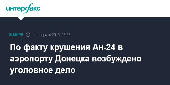Киев. 14 февраля. ИНТЕРФАКС-УКРАИНА - По факту крушения в минувшую среду самолета Ан-24 в Донецком международном аэропорту им С.Прокофьева начато уголовное производство, сообщает пресс-служба прокуратуры Донецкой области.