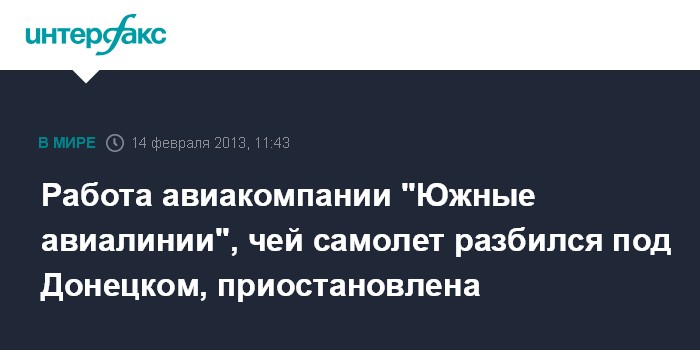 Киев. 14 февраля. INTERFAX.RU - Госавиаслужба Украины приостановила работу авиакомпании "Південні авіалінії" ("Южные авиалинии"), которой принадлежал самолет, потерпевший крушение в аэропорту Донецка 13 февраля.