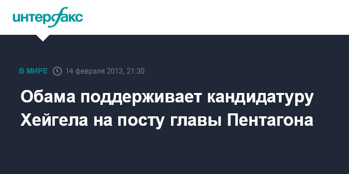 Вашингтон. 14 февраля. INTERFAX.RU - Президент США Барак Обама решительно поддерживает кандидатуру Чака Хейгела на посту нового главы Пентагона, заявили в четверг в Белом доме.