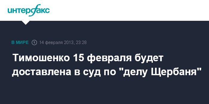 Киев. 14 февраля. INTERFAX.RU - Экс-премьер Украины Юлия Тимошенко в пятницу, 15 февраля, будет доставлена на судебное заседание в Киев на допрос свидетеля по делу об убийстве народного депутата Евгения Щербаня, сообщает пресс-служба Государственной пенитенциарной службы Украины (ГПтС) в четверг вечером.