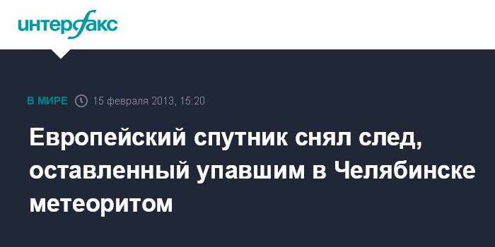 Москва/Париж. 15 февраля. INTERFAX.RU - Европейский метеоспутник Meteosat с помощью прибора SEVIRI смог получить изображение инверсионного следа, оставленного упавшим в Челябинске метеоритом, сообщает Европейское космическое агентство (ЕКА).